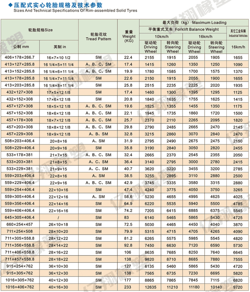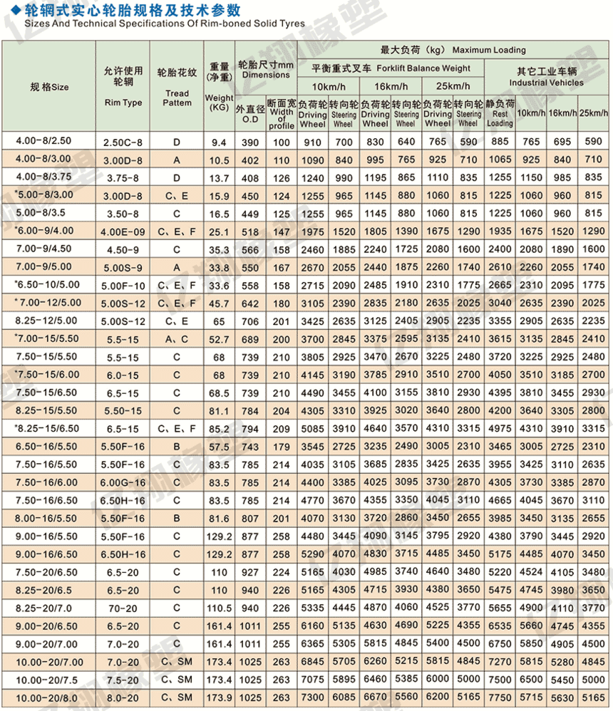 注:有*的為可用于易鎖型輪胎 1、輪胎外徑、斷面寬尺寸為實(shí)際尺寸。2、負(fù)荷下靜半徑為參考尺寸。3、28x9-15/7.0也可標(biāo)注為815-15/7.0。4、僅對(duì)簡(jiǎn)短使用有效,不包括由充氣輪胎換成實(shí)心輪胎時(shí)增加的重量。5、空載叉車的最高速度。 |